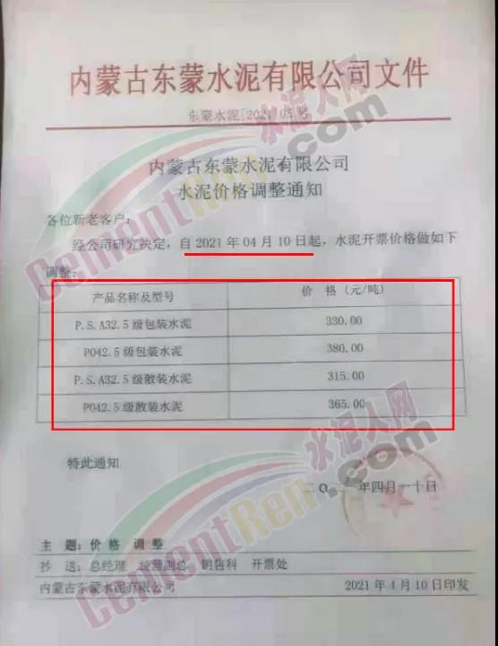 4月10日內(nèi)蒙古東蒙水泥有限公司通知自4月10日起執(zhí)行新的開(kāi)票價(jià)格,其中PO42.5散裝水泥報(bào)價(jià)365元/噸。