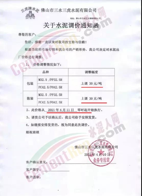 4月10日,佛山市三水三虎水泥有限公司通知自4月11日零時(shí)起各標(biāo)號(hào)水泥上調(diào)30元/噸。
