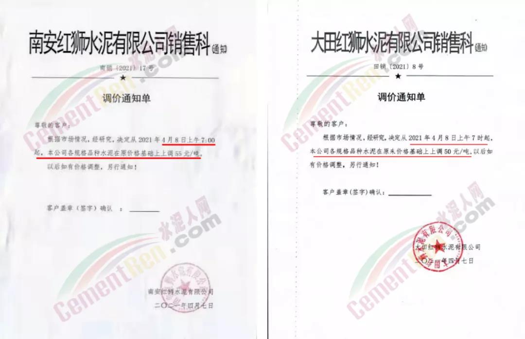 福建南安紅獅、大田紅獅水泥通知,自4月8日上午7時(shí)起,各規(guī)格品種水泥價(jià)格上調(diào)50-55元/噸。