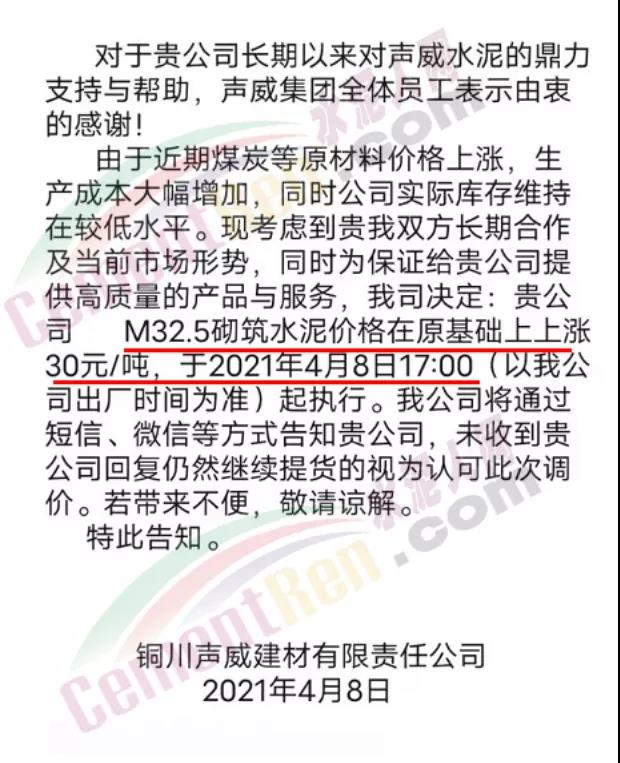 4月8日,銅川聲威建材有限責(zé)任公司通知,M32.5砌筑水泥價(jià)格在原基礎(chǔ)上上漲30元/噸。