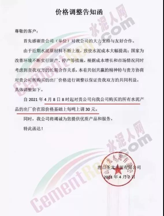唐山圣龍水泥有限公司通知,自4月8日起所有水泥產(chǎn)品的出廠價(jià)在原價(jià)格基礎(chǔ)上上調(diào)30元/噸。