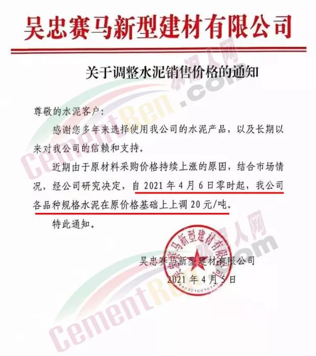 寧夏吳忠賽馬新型建材有限公司通知,自4月6日起,公司各品種規(guī)格水泥在原基礎(chǔ)上上調(diào)20元/噸。