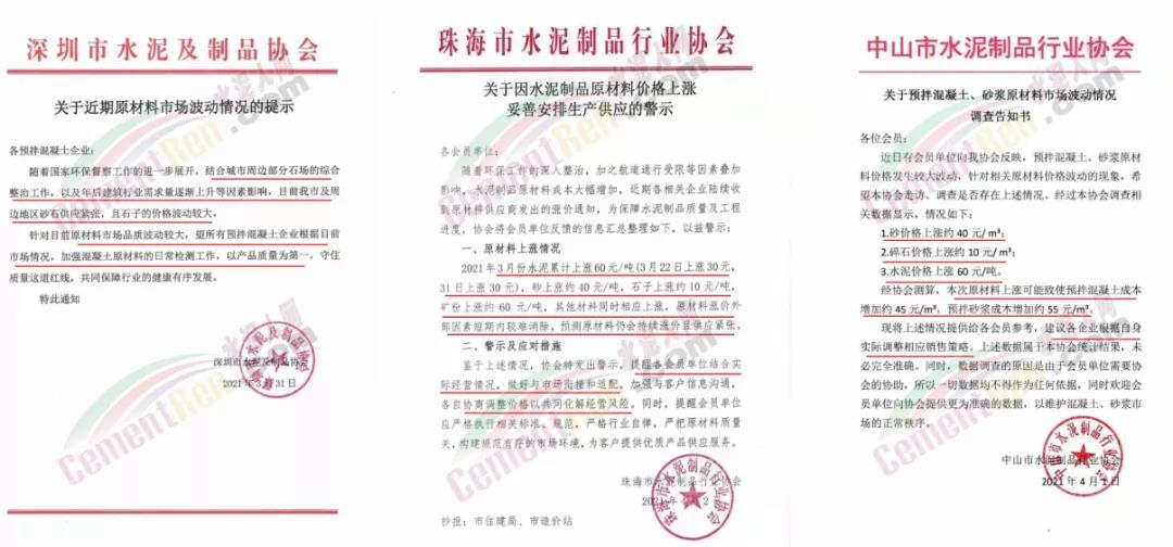 據(jù)水泥人網(wǎng)了解,日前,深圳市水泥及制品協(xié)會(huì)、珠海市水泥制品行業(yè)協(xié)會(huì)、中山市水泥制品行業(yè)協(xié)會(huì)等多家行業(yè)協(xié)會(huì)緊急發(fā)文稱,因水泥、砂石等材料價(jià)格上漲,導(dǎo)致混凝土生產(chǎn)產(chǎn)本增加,但是即使如此也要保證產(chǎn)品質(zhì)量。依據(jù)目標(biāo)情況協(xié)會(huì)建議各企業(yè)根據(jù)自身實(shí)際調(diào)整相應(yīng)銷售策略。