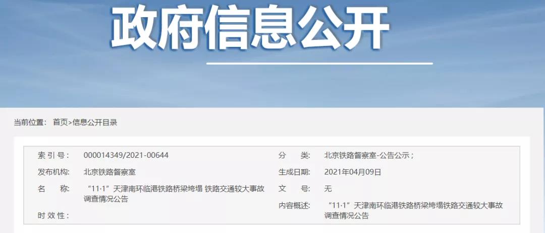 2021年4月9日,國家鐵路局發(fā)布“11·1”天津南環(huán)臨港鐵路橋梁垮塌鐵路交通較大事故調(diào)查情況公告。