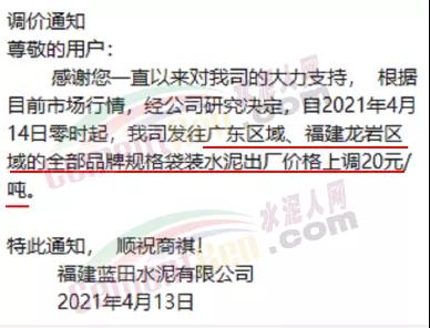 福建藍田水泥通知從4月14日零時起,發(fā)往廣東區(qū)域、福建龍巖區(qū)域的全部品牌規(guī)格袋裝水泥出廠價格上調(diào)20元/噸。