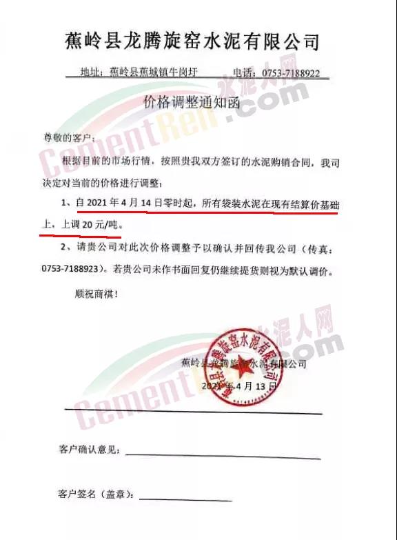 華潤水泥(福建)股份有限公司通知自4月15日零時起,公司發(fā)往粵東地區(qū)、福建龍巖區(qū)域的各品種各規(guī)格型號袋裝水泥在原價基礎(chǔ)上上調(diào)20元/噸。