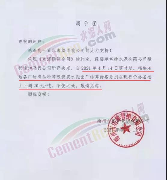 梅州市塔牌營銷有限公司通知,自4月14日零時起,福梅基地各廠所有品種等級水泥出廠結(jié)算價格分別在現(xiàn)行價格基礎(chǔ)上上調(diào)20元/噸。