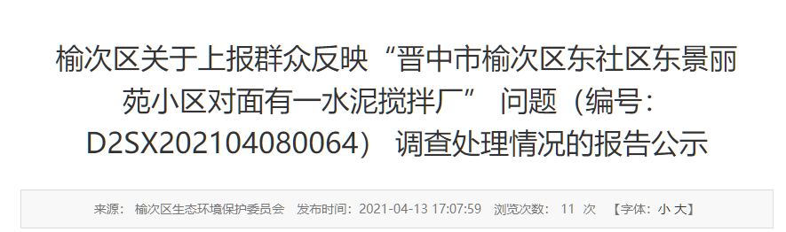 2021年4月8日,收到群眾反映的(編號:D2SX202104080064)環(huán)境問題,榆次區(qū)高度重視,立即安排晉中市生態(tài)環(huán)境局榆次分局進行調(diào)查。經(jīng)查,反映情況屬實,現(xiàn)將有關(guān)情況報告如下: