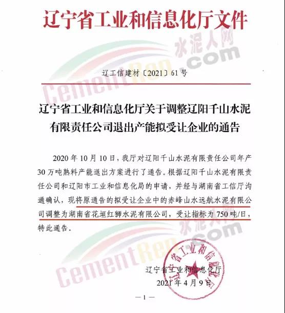 日前,遼寧省工信廳發(fā)布了《遼寧省工業(yè)和信息化廳關(guān)于調(diào)整遼陽千山水泥有限責任公司退出產(chǎn)能擬受讓企業(yè)的通告》稱,將原出讓方案中的擬受讓企業(yè)由赤峰山水遠航水泥有限公司調(diào)整為湖南省花垣紅獅水泥有限公司,受讓指標為750t/d。