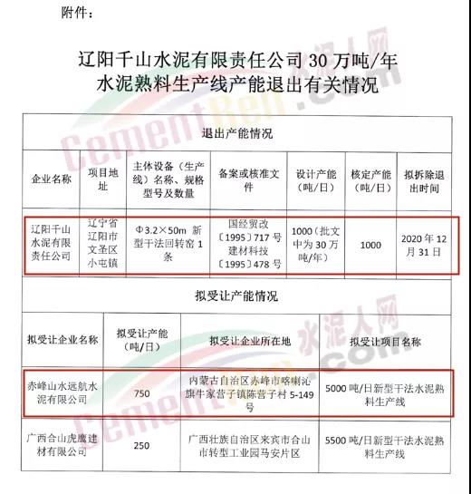 據(jù)了解,去年10月10日,遼寧省工信廳發(fā)布了《遼寧省工業(yè)和信息化廳關(guān)于遼陽千山水泥有限責任公司30萬噸/年水泥熟料產(chǎn)能退出的通告》對遼陽千山水泥有限責任公司30萬噸/年水泥熟料產(chǎn)能退出情況進行公示,赤峰山水遠航水泥有限公司及廣西合山虎鷹建材有限公司分別受讓750t/d水泥熟料產(chǎn)能、250t/d水泥熟料產(chǎn)能。