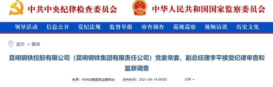 中央紀委國家監(jiān)委網(wǎng)站訊 據(jù)云南省紀委監(jiān)委消息:昆明鋼鐵控股有限公司(昆明鋼鐵集團有限責任公司)黨委常委、副總經(jīng)理李平涉嫌嚴重違紀違法,已主動投案,目前正在接受紀律審查和監(jiān)察調(diào)查。