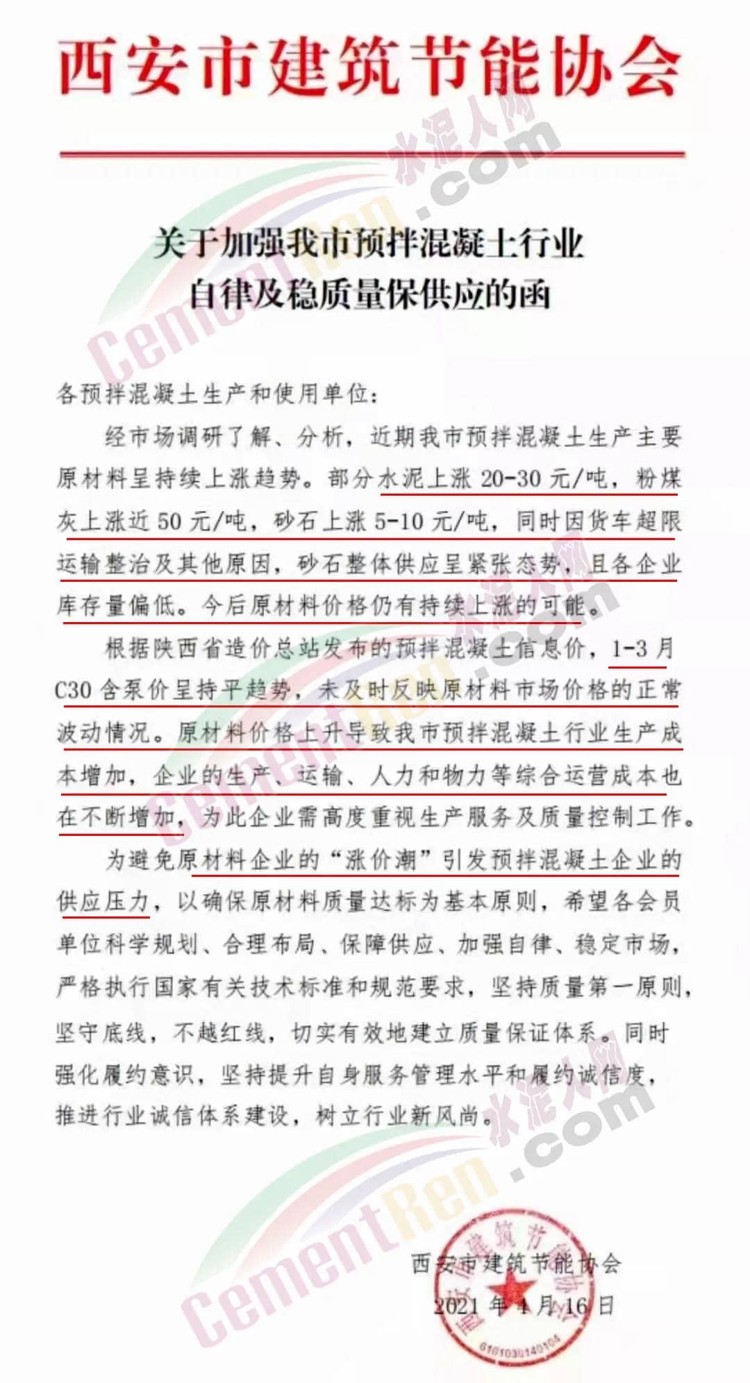 4月16日,陜西省西安市建筑節(jié)能協(xié)會(huì)發(fā)布《關(guān)于加強(qiáng)預(yù)拌混凝土行業(yè)自律及穩(wěn)質(zhì)量保供應(yīng)的函》給各預(yù)拌混凝土生產(chǎn)和使用單位稱,經(jīng)市場(chǎng)調(diào)研了解、分析,近期西安市預(yù)拌混凝土生產(chǎn)主要原材料呈持續(xù)上漲趨勢(shì)。部分水泥上漲 20-30 元/噸,粉煤灰上漲近 50 元/噸,砂石上漲 5-10 元/噸,同時(shí)因貨車超限運(yùn)輸整治及其他原因,砂石整體供應(yīng)呈緊張態(tài)勢(shì),且各企業(yè)庫(kù)存量偏低。今后原材料價(jià)格仍有持續(xù)上漲的可能。