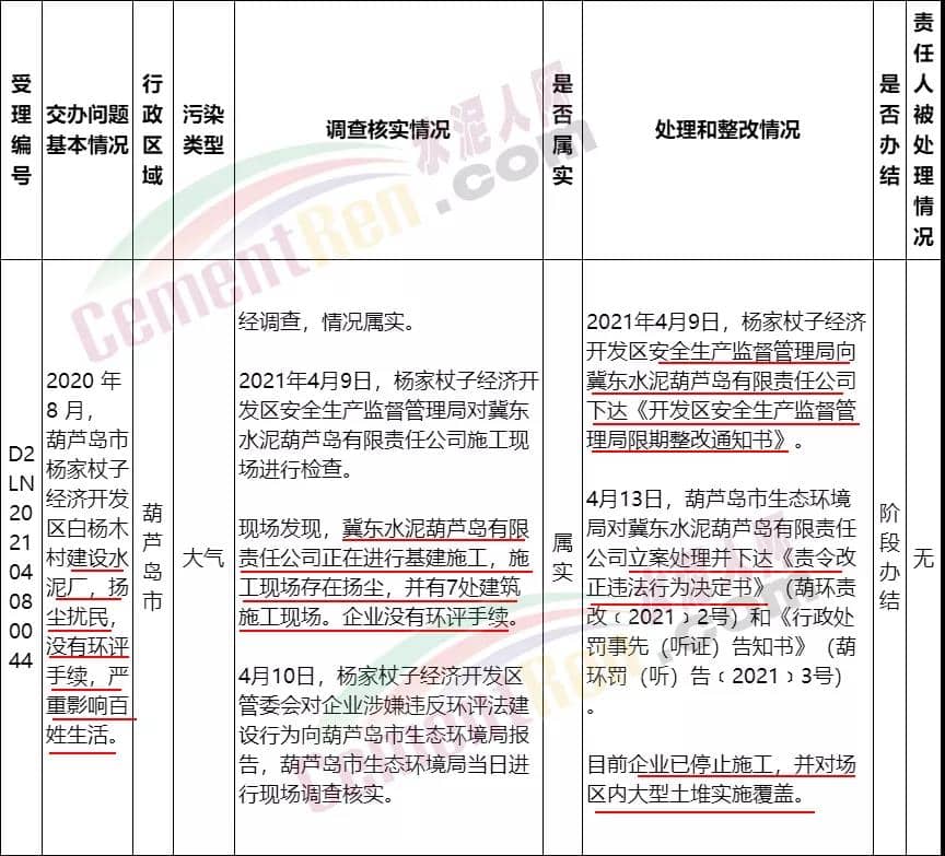 日前,遼寧省生態(tài)環(huán)境廳公布《中央第二生態(tài)環(huán)境保護(hù)督察組群眾信訪舉報(bào)轉(zhuǎn)辦和邊督邊改公開(kāi)情況一覽表(第3批 2021年4月18日)》提到一起階段性辦結(jié)信訪,涉及冀東水泥葫蘆島有限責(zé)任公司。