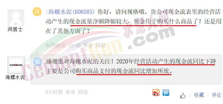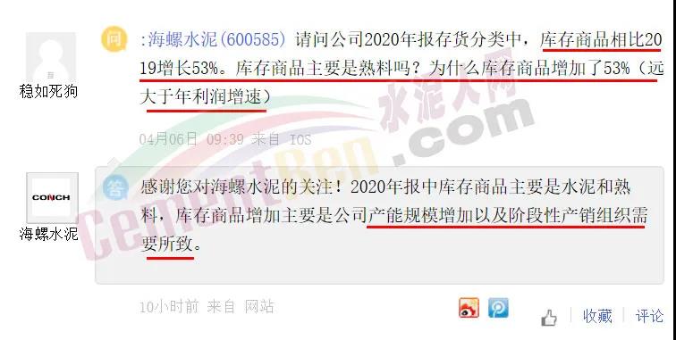 日前,有投資者在上市平臺向海螺水泥提問關(guān)于2020年報存貨分類中,庫存商品相比2019增長53%,遠大于年利潤增速相關(guān)問題。