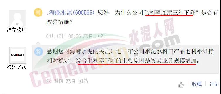 針對于海螺水泥綜合毛利率下降的原因,海螺水泥表示,近三年公司水泥熟料自產(chǎn)品毛利率維持相對穩(wěn)定,綜合毛利率下降的主要原因是貿(mào)易業(yè)務(wù)規(guī)模增加。