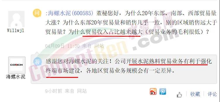關(guān)于企業(yè)貿(mào)易量增加的問題,海螺水泥回復(fù)稱,公司開展水泥熟料貿(mào)易業(yè)務(wù)有利于強化終端市場建設(shè)。