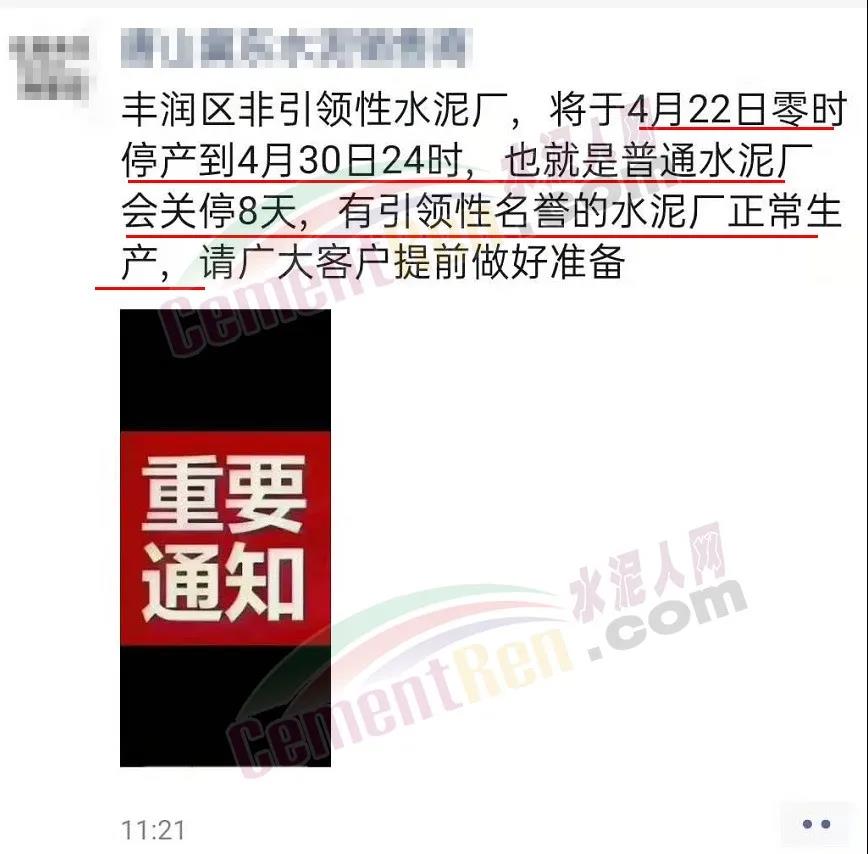 水泥人網(wǎng)通訊員消息:日前,河北唐山豐潤區(qū)水泥經(jīng)銷商通知,“豐潤區(qū)非引領(lǐng)性水泥廠,將于4月22日零時(shí)停產(chǎn)到4月30日24時(shí),也就是普通水泥廠會(huì)關(guān)停8天,有引領(lǐng)性名譽(yù)的水泥廠正常生產(chǎn)”。同時(shí),區(qū)域內(nèi)部分企業(yè)已經(jīng)率先通知上調(diào)水泥價(jià)格。