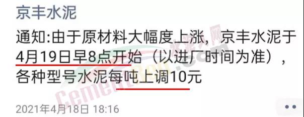 京豐水泥通知由于原材料大幅度上漲,京豐水泥于4月19日早8時(shí)上調(diào)各型號水泥價(jià)格10元/噸。