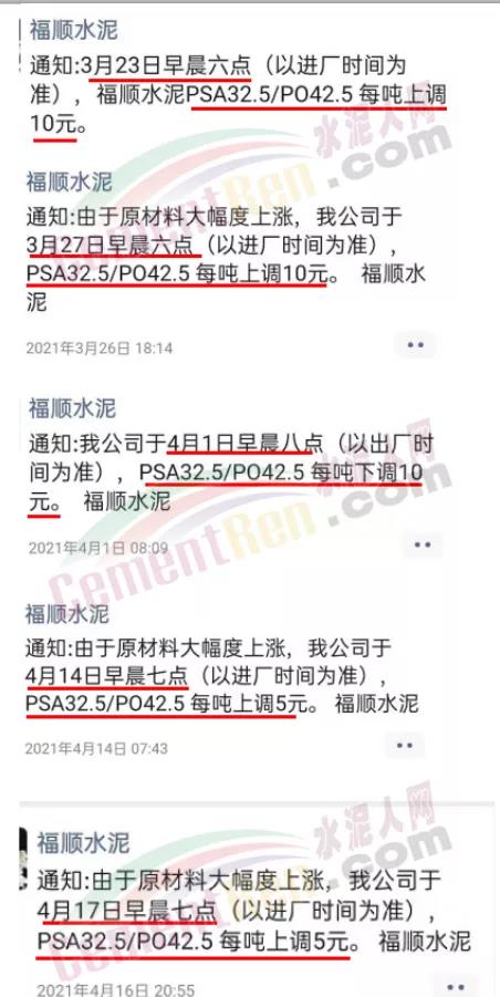 福順?biāo)嗤ㄖ?由于原材料大幅度上漲,公司于4月17日早七點(diǎn),PSA32.5/PO42.5上調(diào)5元/噸。據(jù)水泥人網(wǎng)了解,自3月下旬開始福順?biāo)嘁讯啻紊险{(diào)水泥價(jià)格,累計(jì)上調(diào)40元/噸。