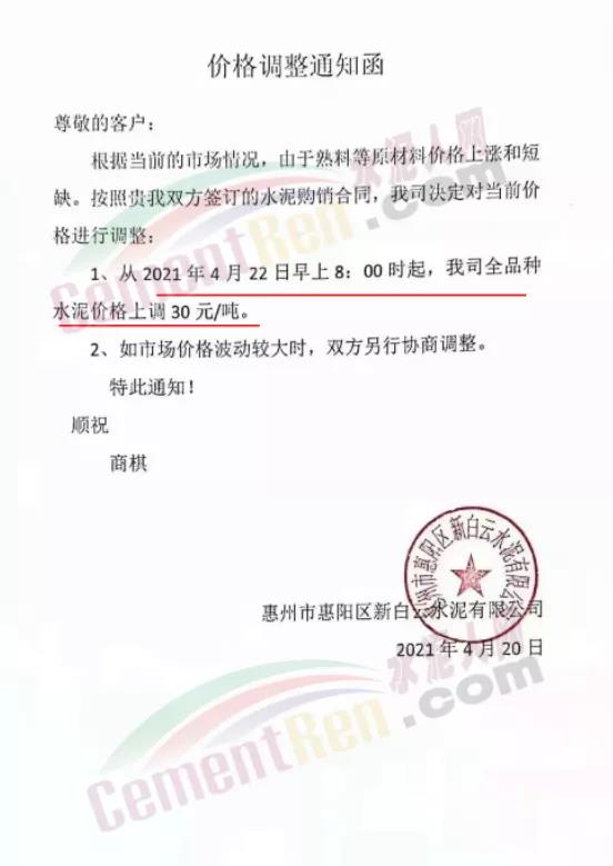 近期珠三角區(qū)域再次迎來全品種水泥價(jià)格上調(diào)30元/噸,惠州市惠陽區(qū)新白云水泥有限公司通知根據(jù)當(dāng)前的市場情況,由于熟料等原材料價(jià)格上漲和短缺。公司決定從4月22日早上8時(shí)起,全品種水泥價(jià)格上調(diào)30元/噸。
