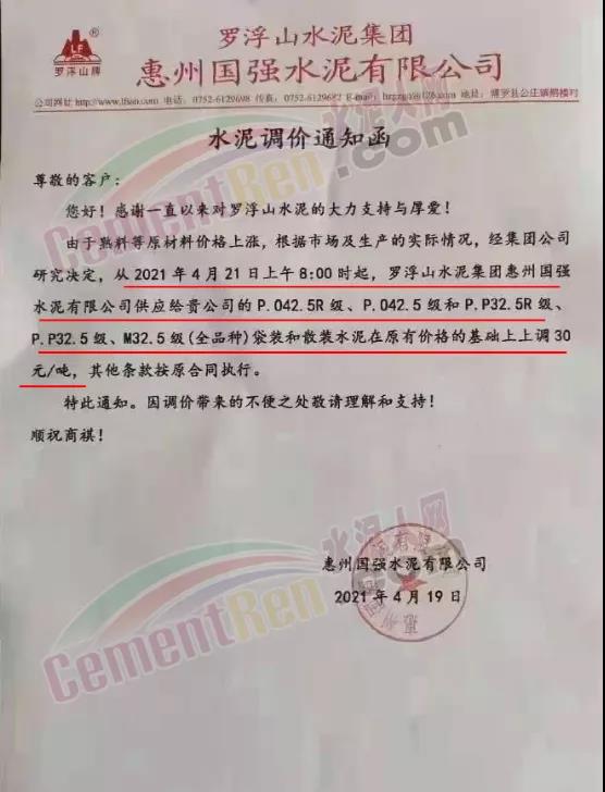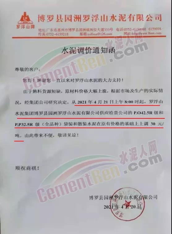博羅縣園洲羅浮山水泥有限公司羅浮山牌通知由于熟料貨源短缺,原材料價(jià)格大幅上漲,根據(jù)市場及生產(chǎn)的實(shí)際情況,經(jīng)集團(tuán)公司研究決定,從4月21日上午8時(shí)起,公司P.O42.5R級和P.P32.5R級(全品種)袋裝和散裝水泥在原有價(jià)格的基礎(chǔ)上上調(diào)30元/噸。