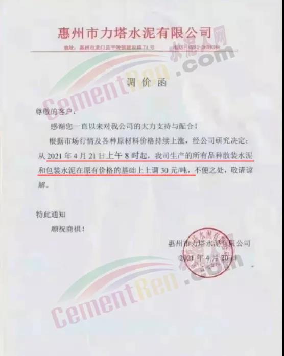 惠州市力塔水泥有限公司通知根據(jù)市場行情及各種原材料價(jià)格持續(xù)上漲,經(jīng)公司研究決定從4月21日上午8時(shí)起,公司生產(chǎn)的所有品種散裝水泥和包裝水泥在原有價(jià)格的基礎(chǔ)上上調(diào)30元/噸。