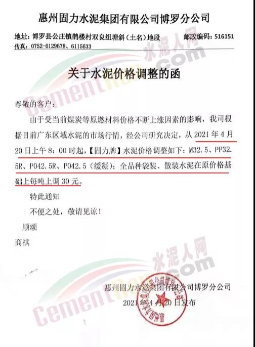 惠州固力水泥集團(tuán)有限公司通知,由于受當(dāng)前煤炭等原燃材料價(jià)格不斷上漲因素的影響,經(jīng)公司研究決定,從4月20日上午8時(shí)起,“固力牌”水泥M32.5、PP32.5R、PO42.5R、PO42.5(緩凝),全品種袋裝、散裝水泥在原價(jià)格基礎(chǔ)上每噸上調(diào)30元。
