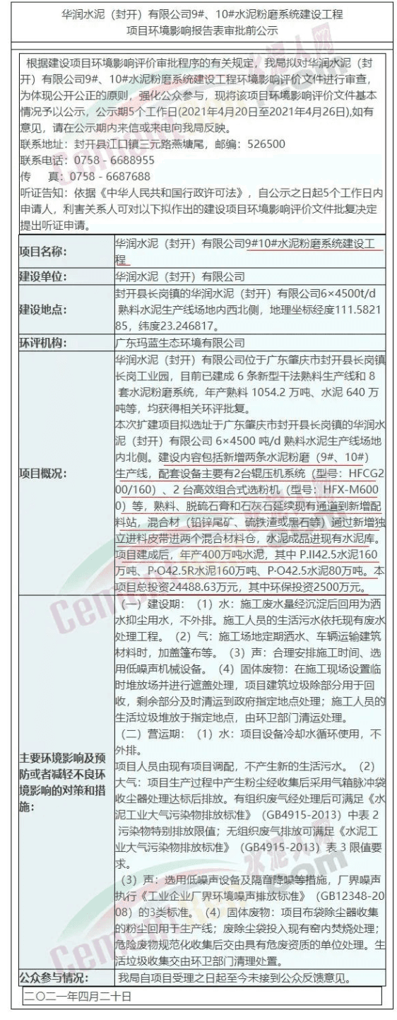 4月20日,廣東省肇慶市生態(tài)環(huán)境局肇慶封開分局發(fā)布《華潤水泥(封開)有限公司9#、10#水泥粉磨系統(tǒng)建設(shè)工程項目環(huán)境影響報告表審批前公示》提到華潤水泥(封開)有限公司次將新建兩條水泥粉磨(9#、10#)生產(chǎn)線。