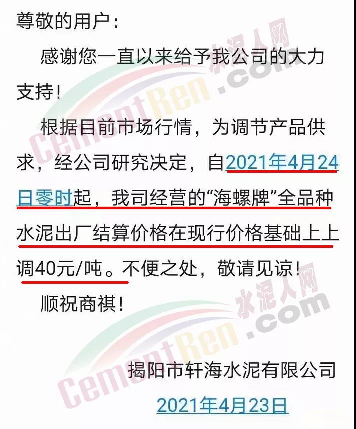 揭陽市軒海水泥有限公司通知自4月24日零時起,公司經(jīng)營的“海螺牌”全品種水泥出廠結(jié)算價格在現(xiàn)行價格基礎(chǔ)上上調(diào)40元/噸。
