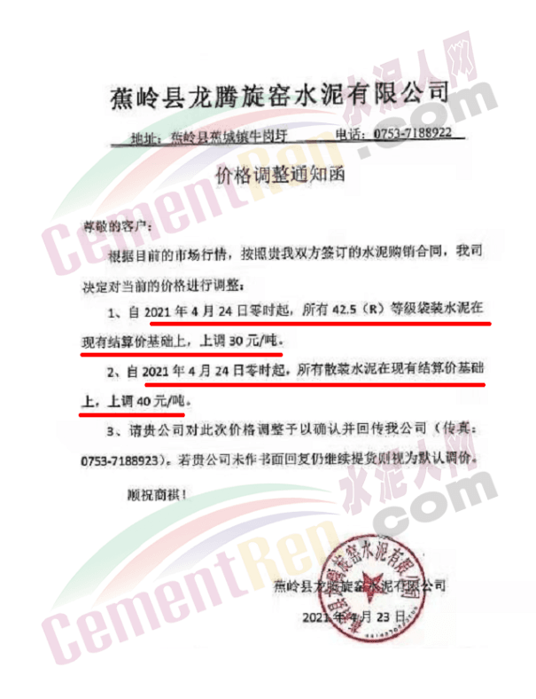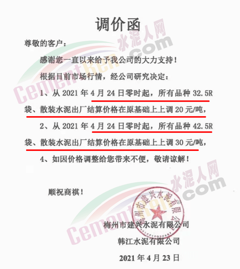 梅州皇馬水泥有限公司通知,從2021年4月24日零時起,P.O42.5及以上等級袋裝水泥出廠單價分別在原價格基礎(chǔ)上上調(diào)30元/噸;P.O42.5及以上等級散裝水泥出廠單價分別在原價格基礎(chǔ)上上調(diào)40元/噸。