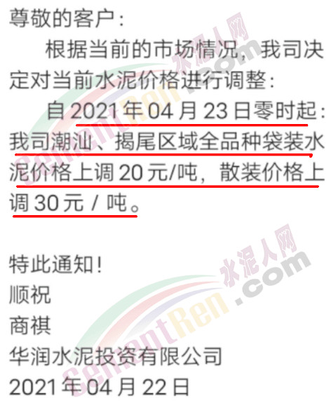 華潤水泥投資有限公司通知自4月23日零時起,公司潮汕、揭尾區(qū)域全品種袋裝水泥價格上調(diào)20元/噸,散裝價格上調(diào)30元/噸。