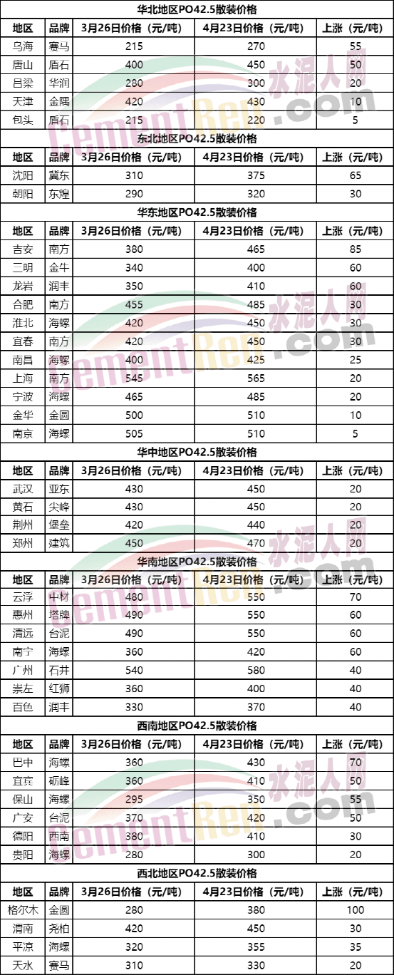 從市場情況來看,4月初、中旬國內(nèi)水泥價格上漲,主要是因為部分地區(qū)重大基建項目密集開工,市場需求基本恢復(fù)到正常水平,加之熟料價格連續(xù)回漲帶動所致。