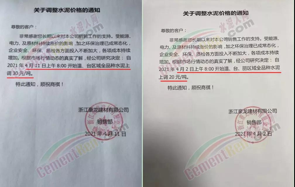4月2日上午8∶00開始溫、臺、麗區(qū)域全品種水泥上調20元/噸。