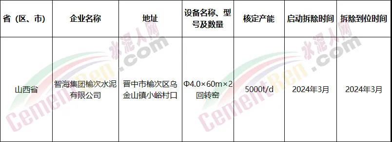 退出產(chǎn)能情況顯示,智海集團(tuán)榆次水泥有限公司退出位于晉中市榆次區(qū)烏金山鎮(zhèn)小峪村的Φ4.0×60m×2回轉(zhuǎn)窯(核定產(chǎn)能5000t/d)并將于2024年3月啟動(dòng)拆除。