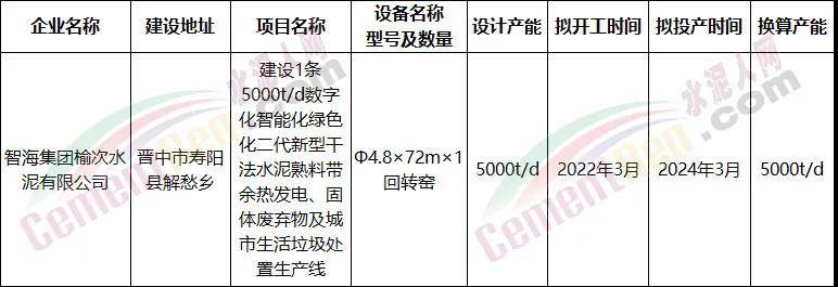 建設(shè)項(xiàng)目情況顯示,智海集團(tuán)榆次水泥有限公司將在晉中市壽陽(yáng)縣解愁鄉(xiāng)區(qū)域內(nèi)建設(shè)1條5000t/d數(shù)字化智能化綠色化二代新型干法水泥熟料帶余熱發(fā)電、固體廢棄物及城市生活垃圾處置生產(chǎn)線, 關(guān)鍵設(shè)備為Φ4.8×72m×1回轉(zhuǎn)窯(設(shè)計(jì)產(chǎn)能5000t/d)擬開工時(shí)間2022年3月,并將于2024年3月投產(chǎn),置換比例1:1。
