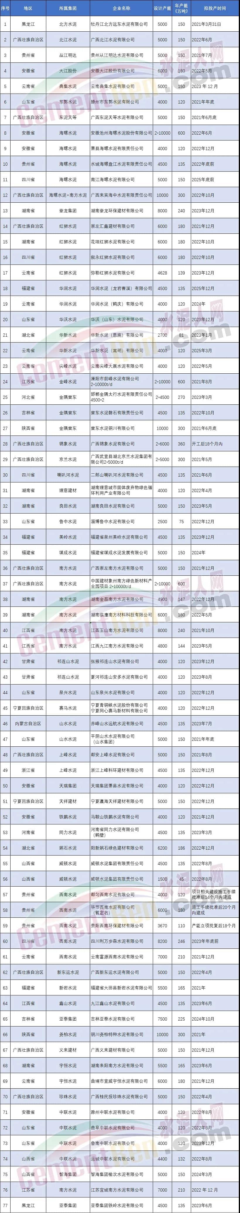 中國建材集團南方水泥、西南水泥、中聯(lián)水泥、北方水泥、祁連山、賽馬水泥等多家企業(yè)目前在建擬建生產(chǎn)線共22條熟料生產(chǎn)線,合計產(chǎn)能達3539萬噸。