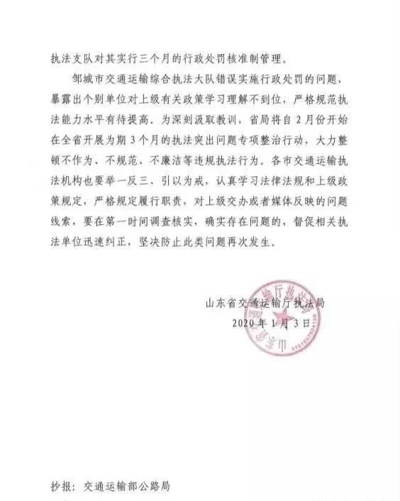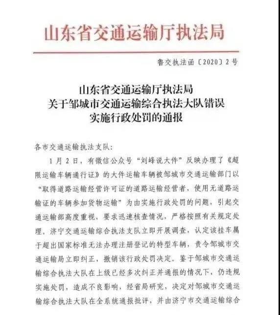 2020年1月3日,山東省交通運輸廳執(zhí)法局下發(fā)了《關(guān)于鄒城市交通運輸綜合執(zhí)法大隊錯誤實施行政處罰的通報》(魯交執(zhí)法函〔2020〕2號)。1月6日,劍群公司接到了鄒城市交通運輸局簽發(fā)的《撤銷案件決定書》,退還罰款8000元。至此,該案宣告銷案。