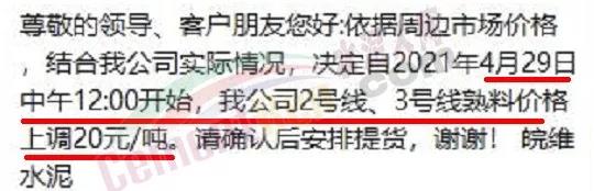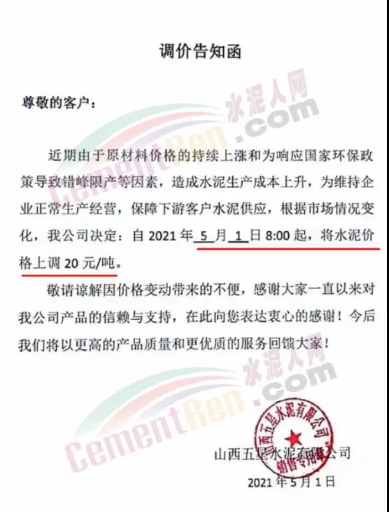 山西五星水泥有限公司發(fā)通知稱,近期由于原材料價格的持續(xù)上漲和為響應(yīng)國家環(huán)保政策導(dǎo)致錯峰限產(chǎn)等因素,造成水泥生產(chǎn)成本上升,為維持企業(yè)正常生產(chǎn)經(jīng)營,保障下游客戶水泥供應(yīng),根據(jù)市場情況變化,公司決定自2021年5月1日8時起,將水泥價格上調(diào)20元/噸。