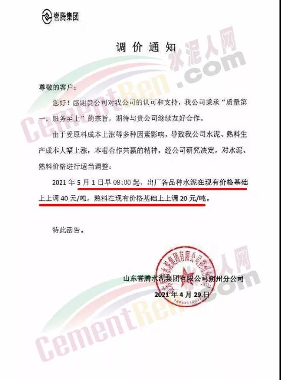 山東譽(yù)騰水泥集團(tuán)有限公司朔州分公司通知由于受原料成本上漲等多種因素影響,導(dǎo)致公司水泥、熟料生產(chǎn)成本大幅上漲,本著合作共贏的精神,經(jīng)公司研究決定,對水泥、熟料價格進(jìn)行適當(dāng)調(diào)整。自2021年5月1日早08時起,出廠各品種水泥在現(xiàn)有價格基礎(chǔ)上上調(diào)40元/噸,熟料在現(xiàn)有價格基礎(chǔ)上上調(diào)20元/噸。