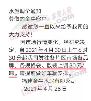 福建金牛水泥有限公司通知自2021年4月30日上午6時30分起公司發(fā)往各片區(qū)市場各品牌,各規(guī)格袋、散裝上調(diào)30元/噸。