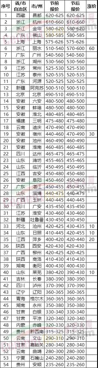 從上述水泥人網(wǎng)信息中心重點(diǎn)監(jiān)控的五十多個區(qū)域近期報價可見,華東及華南地區(qū)仍處于價格漲勢較強(qiáng)區(qū)域,市場報價多在500元/噸以上,600元/噸以上區(qū)域多分布在上海市及周邊浙江各市,節(jié)前浙江省杭州市部分主流品牌水泥價格上漲30元/噸,42.5散裝工程配送報價最高已達(dá)660元/噸,與超過700元/噸,只差一張“漲價函”了。