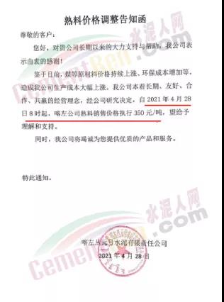 遼寧山水旗下喀左叢元號水泥有限責(zé)任公司發(fā)熟料價格調(diào)整告知函稱,鑒于目前原燃材料價格持續(xù)上漲、環(huán)保成本增加等,造成公司生產(chǎn)成本大幅上漲。經(jīng)研究決定自2021年4月28日8時起,喀左公司熟料銷售價格執(zhí)行350 元/噸。
