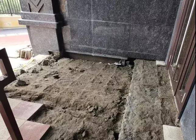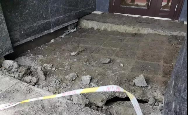 業(yè)主說(shuō),4月15日開(kāi)發(fā)商通知收房,他24日去小區(qū)辦手續(xù),上午9點(diǎn)通過(guò)單元樓門(mén)庭時(shí),地面還好著,非常平整;但是當(dāng)他11點(diǎn)多從里面出來(lái)時(shí),發(fā)現(xiàn)門(mén)庭塌陷了。