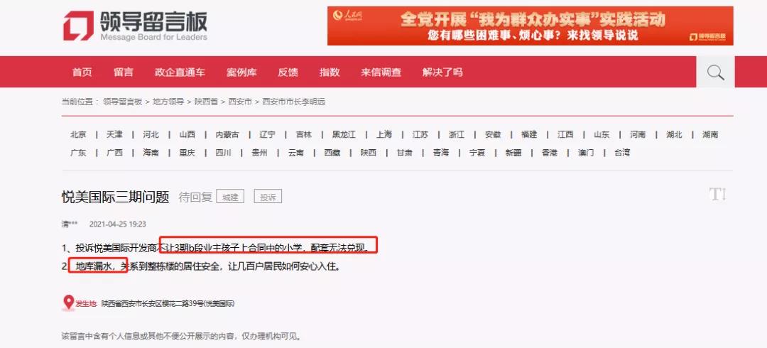 4月29日下午,西安市長(zhǎng)安區(qū)政府在領(lǐng)導(dǎo)留言板上作出答復(fù),內(nèi)容為“網(wǎng)民朋友:您好!您反映的問(wèn)題經(jīng)調(diào)查,針對(duì)地庫(kù)漏水檢測(cè)維修問(wèn)題,由建設(shè)單位聯(lián)系檢測(cè)單位進(jìn)行檢測(cè),根據(jù)檢測(cè)結(jié)果確定整改方案,進(jìn)行維修。針對(duì)15號(hào)樓門(mén)廊地面塌陷問(wèn)題,由建設(shè)單位聯(lián)系原沉降觀測(cè)單位對(duì)15號(hào)樓體進(jìn)行變形監(jiān)測(cè),根據(jù)監(jiān)測(cè)結(jié)果由建設(shè)單位出具維修方案進(jìn)行維修,維修合格后交付使用。本期交付悅美國(guó)際三期的15#、17#、21#樓自4月24日起已停止交房。長(zhǎng)安區(qū)住建局將持續(xù)跟進(jìn)問(wèn)題處置,確保各項(xiàng)反映問(wèn)題得到解決。”