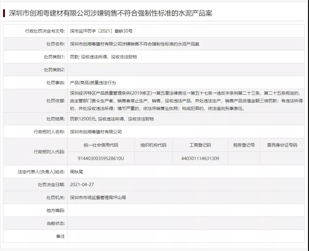 日前,深圳市市場(chǎng)監(jiān)督管理局坪山局對(duì)深圳市創(chuàng)湘粵建材有限公司涉嫌銷售不符合強(qiáng)制性標(biāo)準(zhǔn)的水泥產(chǎn)品案作出行政處罰決定,罰款12000元,沒收違法所得、沒收非法財(cái)物。行政處罰決定書文號(hào)為深市監(jiān)坪罰字〔2021〕碧嶺30號(hào)。
