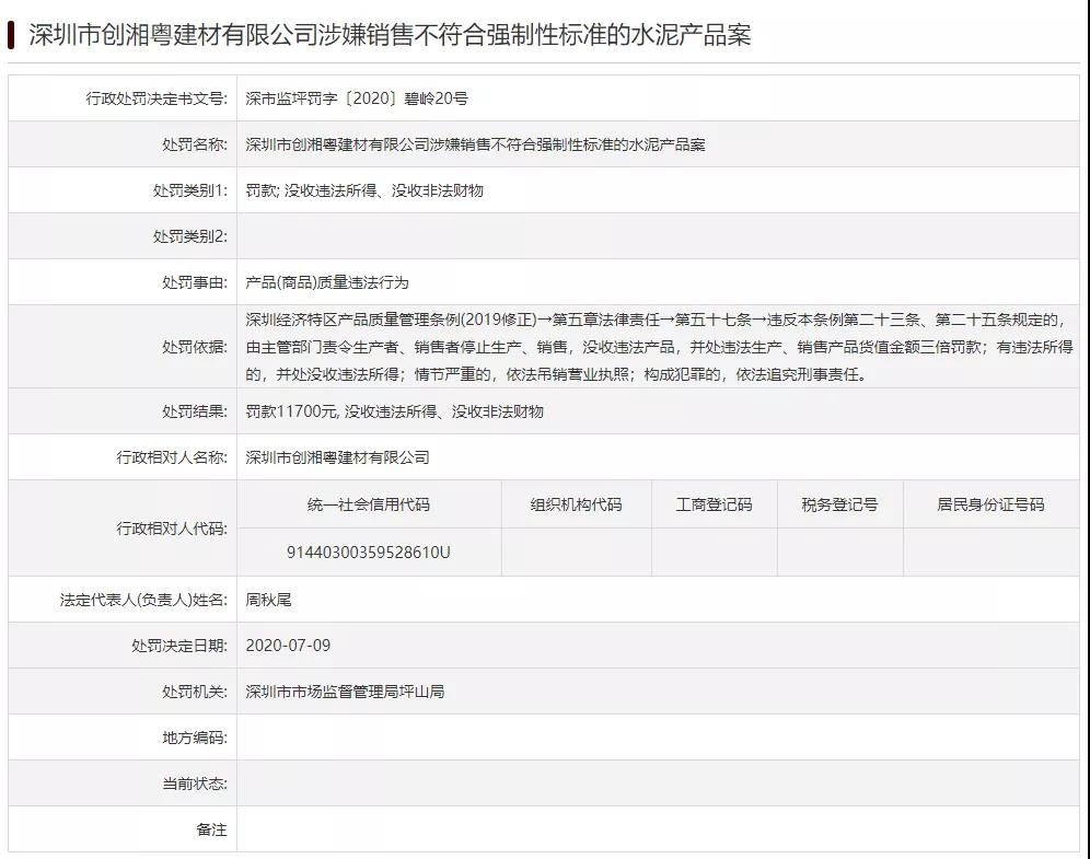 據(jù)查詢,坪山市場(chǎng)監(jiān)管局曾于2020年7月9日對(duì)該企業(yè)進(jìn)行行政處罰,罰款金額11700,沒收違法所得和非法財(cái)務(wù)11700 。且處罰原因同樣也是涉嫌銷售不符合強(qiáng)制性標(biāo)準(zhǔn)的水泥產(chǎn)品。