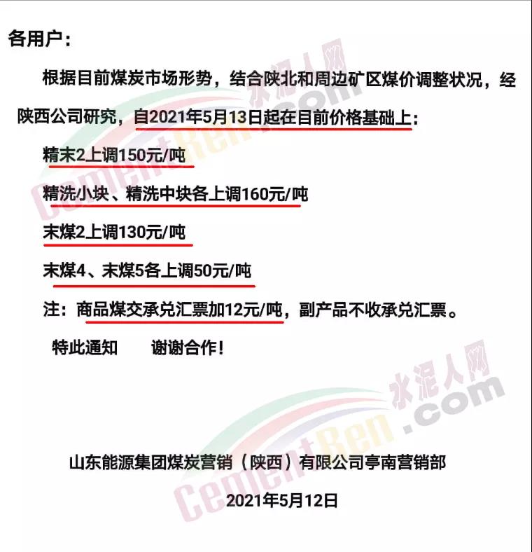 河南某水泥企業(yè)采購(gòu)人員對(duì)水泥人網(wǎng)表示,12日收到通知,煤價(jià)再漲150元/噸,到廠價(jià)都1100元/噸了。