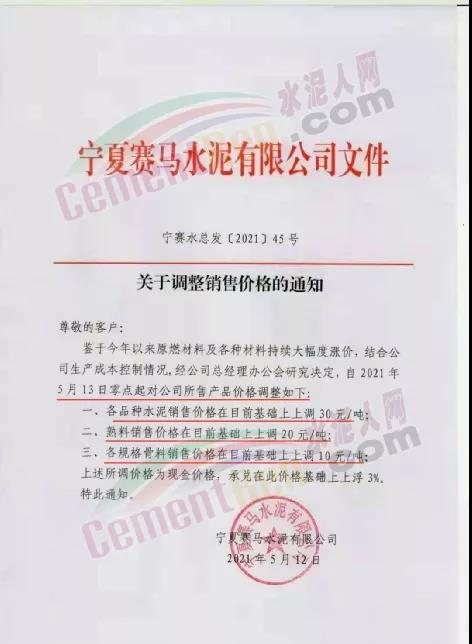 寧夏賽馬水泥通知,鑒于今年以來原燃材料及各種材料持續(xù)大幅度漲價(jià),結(jié)合公司生產(chǎn)成本控制情況,經(jīng)公司總經(jīng)理辦公會(huì)研究決定,自2021年5月13日零點(diǎn)起對(duì)公司所售各品種水泥上調(diào)30元/噸,熟料上調(diào)20元/噸,各規(guī)格骨料銷售價(jià)格上調(diào)10元/噸。上述所調(diào)價(jià)格為現(xiàn)金價(jià)格,承兌在此價(jià)格基礎(chǔ)上上浮3%。