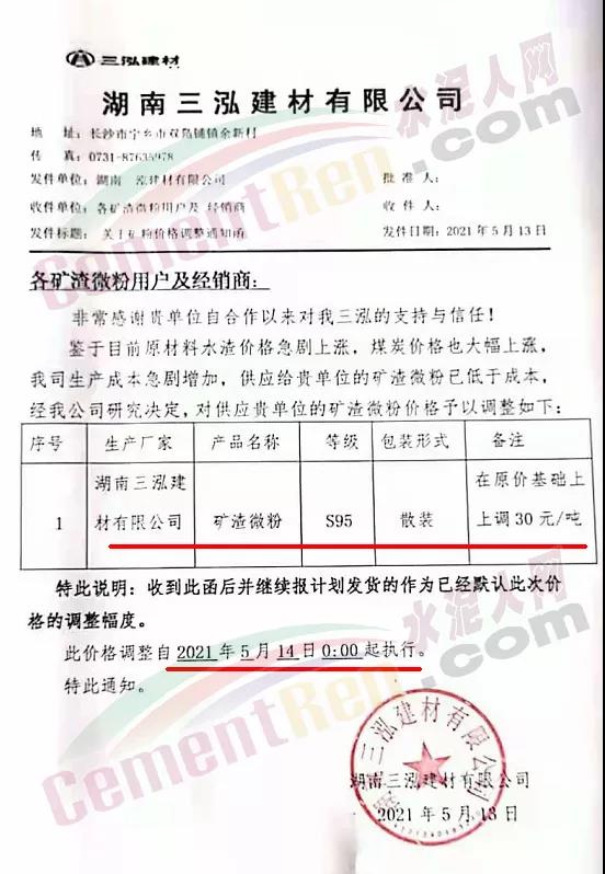 同期,湖南多家礦粉企業(yè)通知上調(diào)礦粉價(jià)格。湖南三泓建材有限公司通知稱因原材料價(jià)格不斷上漲,成本急劇增加,經(jīng)公司研究決定,從2021年5月14日開始,對(duì)所有區(qū)域礦粉價(jià)格在原來基礎(chǔ)上上調(diào)30元/噸。