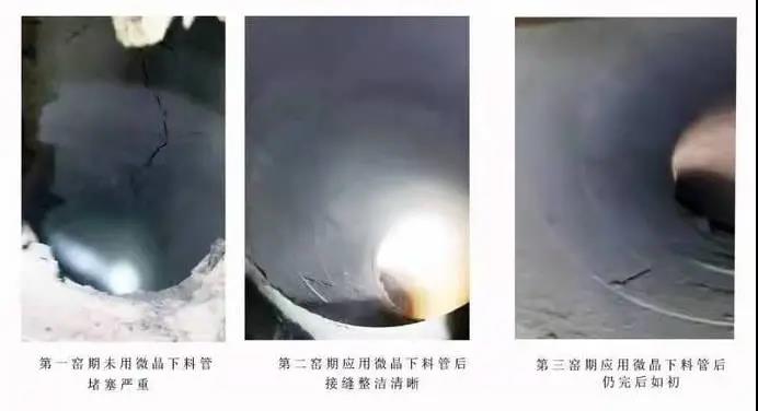 2020年10月份水泥窯檢修時(shí)發(fā)現(xiàn)整體微晶下料管內(nèi)沒有任何結(jié)皮,下料管的接口條紋清新可見,工程技術(shù)人員對(duì)此狀況驚嘆不已,當(dāng)場(chǎng)決定不做任何修正繼續(xù)使用。又經(jīng)過第二窯期的運(yùn)行至今年四月底,再次停窯后發(fā)現(xiàn)下料管仍完好如初,于是順利投入了第三個(gè)窯期的運(yùn)行。
